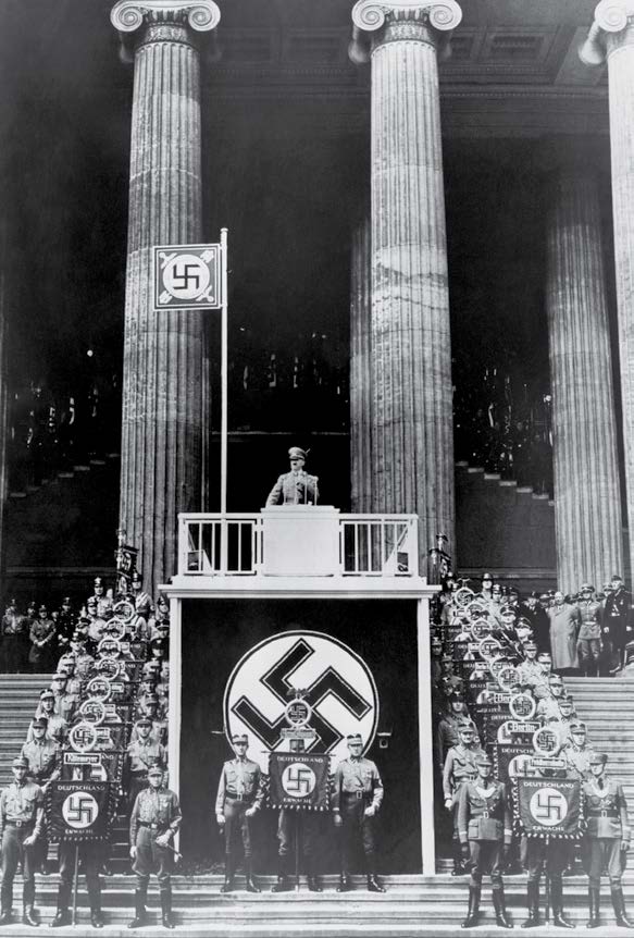 El segundo de los factores que citamos es el propio espacio-tiempo del discurso. Podía tratarse de gran- des locales, como la famosa cervecería de Múnich, o de lugares al aire libre, pero la concurrencia siempre era muy numerosa y los espacios estaban decorados por un gran número de grandes banderas del NSDAP con sus esvásticas negras, las cuales formaban, tanto en el día como en la noche, a la luz de antorchas y lámparas, un recinto de propiedades mágicas, un auténtico campo de acción para el médium.